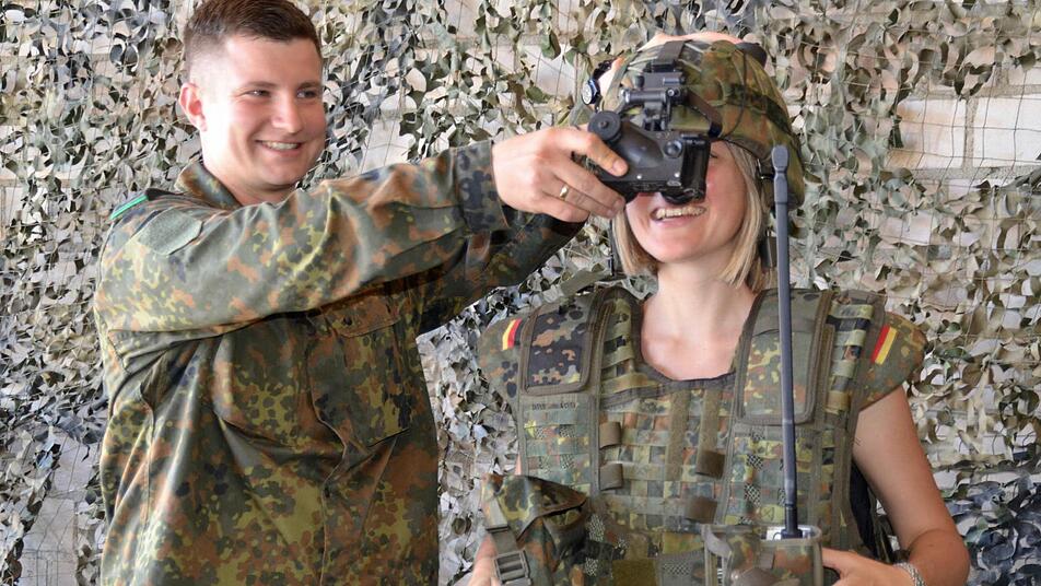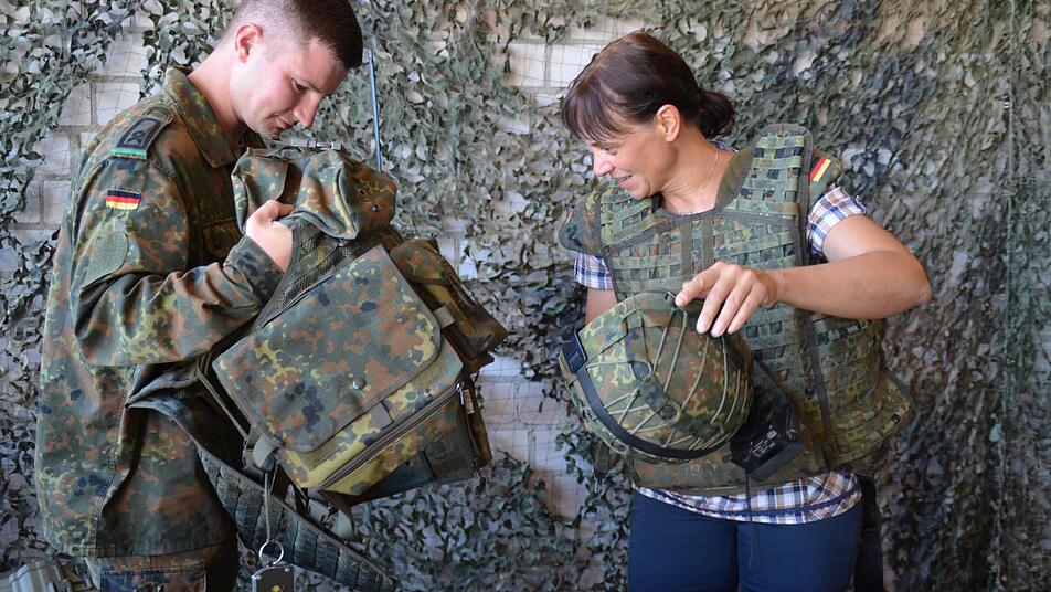 Sie und die anderen Frauen der Delegation interessieren sich an diesem Tag nicht nur für die körperlichen Herausforderungen oder Fahrzeug- und Waffenkunde, sondern auch für das Zwischenmenschliche. So wollen sie beispielsweise wissen, wie schwer die Kampfausrüstung ist. Geduldig erklärt Hauptfeldwebel Viktor Nagel, was alles dazu gehört und lässt die Frauen die zwischen 15 und 20 Kilogramm schwere Schutzausrüstung auch mal anprobieren. "Es ist eine Erleichterung, den eigenen Rucksack wieder auf dem Rücken zu haben", gibt Martina Beck, die in der Kasse der Bad Bockleter Gemeindeverwaltung tätig ist, danach ehrlich zu.