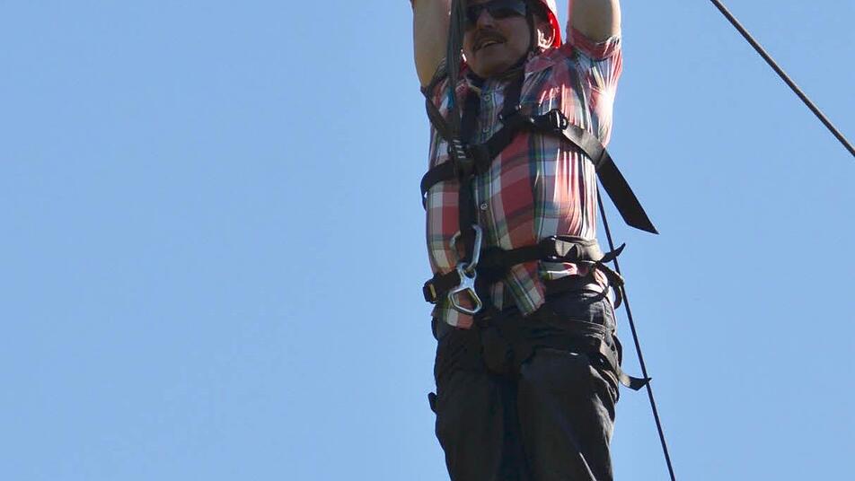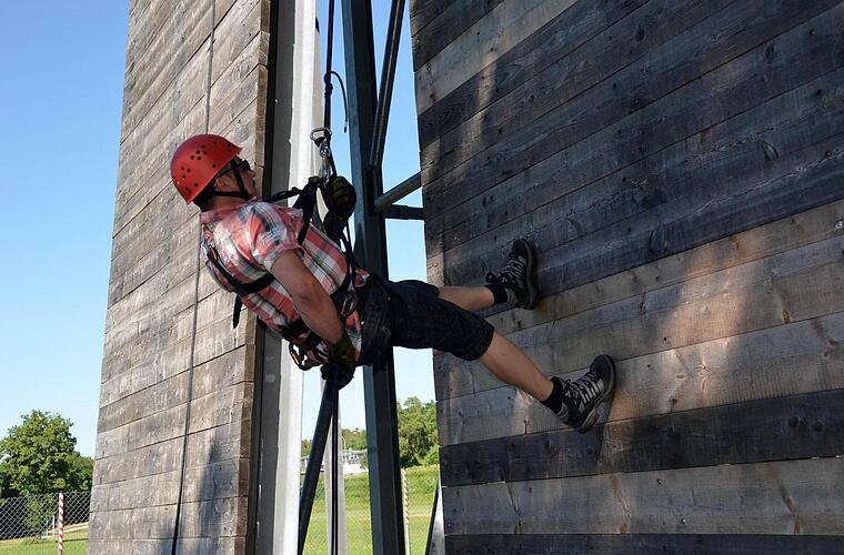 Unten angekommen, schnauft der Kraxler erst einmal tief durch. "Es war gut", sagt er kurz und fügt hinzu: "Das Schwierigste war die Überwindung, sich rückwärts rauszulegen." Und schon macht er sich auf den Weg zur nächsten Herausforderung - der Seilrutsche. Schließlich ist sein Alltag sonst nicht so spannend.