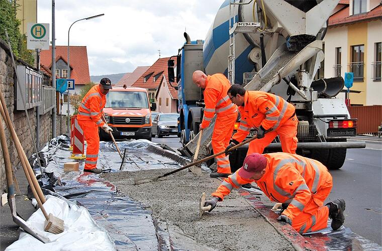 Da die jetzige Maßnahme nur ein Versuch mit noch ungewissem Ergebnis ist, wurde die auf der Kirchenseite aufzufüllende Haltebucht am Dienstag zunächst mit einer robusten Folie ausgelegt und mit Holzbohlen die neue Bordsteinkante markiert. Erst danach wurde der flüssige Beton eingefüllt. Zum Rückbau braucht dann nur diese neue Betonschicht abgetragen werden, um den alten Zustand wieder herzustellen.