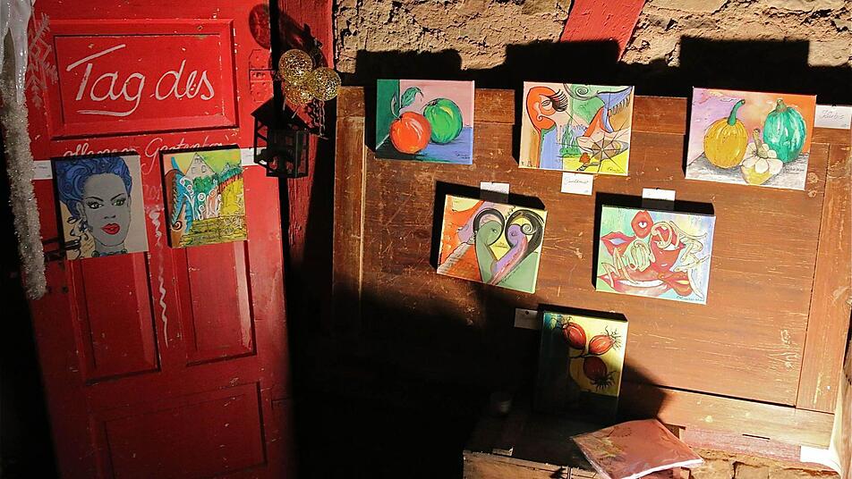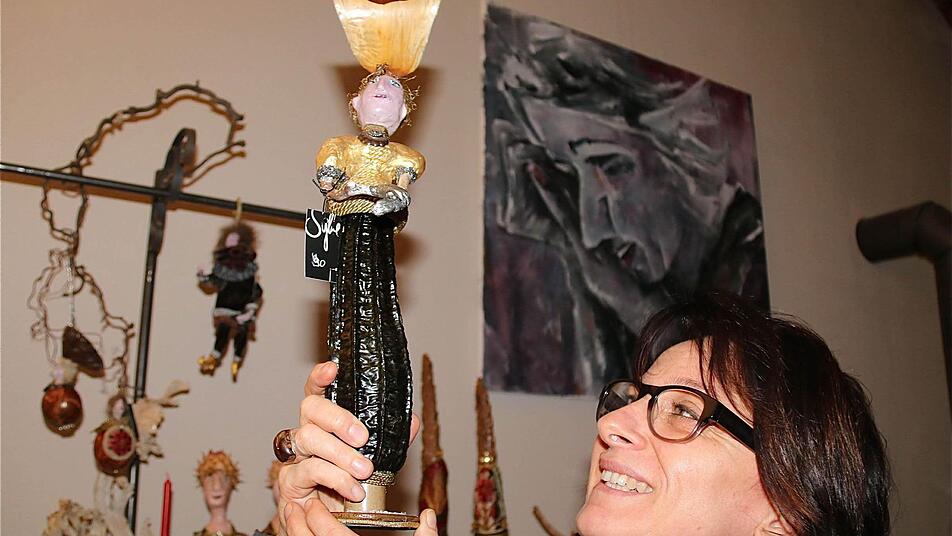 Künstlerambiente verbreitete sich unter dem Gewölbe des Weinhotels Müller in der Löwengasse. Dort faszinierte Sylvie Scherpf mit Fantasie-Seelenfiguren und Gemälden. "Das sind kleine Persönlichkeiten, die ich aus Steinen, Holz, Pflanzenblättern oder Kürbis erschuf", sagt die Künstlerin. In ihrer direkten Nachbarschaft war auch die Hammelburger Künstlerin Stephanie Baier-Bindrum anzutreffen, die Holzscheite und alte Holzteile, wie zum Beispiel Räderspeichen, mit ihrer Malkunst veredelte.