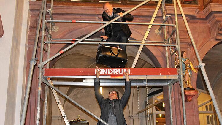 Henry Purcells "Trumpet Tune" zur Eröffnung des Gottesdienstes wird ein fröhlich mitreißender Hymnus an den Ort, an die Kirchengemeinde und ein Lobgesang an Franz von Assisi, den großen Veränderer seiner Zeit, dem dieser Gottesdienst gewidmet ist. Erstaunlich, was Kantor Dieter Blum aus der seit Langem nicht mehr gepflegten Orgel herauszuholen imstande ist. Er versteht die Schwächen des Instruments mit präzisem Anschlag und sicherer Registerauswahl auszugleichen, die Lage des Orgelprospekts hoch unter dem gotisch gewölbten Kirchendach hilft zu einer ausgewogenen Klangfülle. Dazu setzt die schlanke und präzise Tongebung der Trompete von Bernhard Reußner, die strahlenden Obertöne der Melodie, eindrucksvoll dazu. Kantor und Trompeter kennen sich aus Würzburger Zeiten, kurze Blicke der Verständigung genügen, es entsteht ein durchgängig harmonischer Gesamteindruck im Zusammenspiel. Dabei haben die beiden Protagonisten schon ein halsbrecherisches Abenteuer in der Kirche bestanden. Wegen einer Renovierung ist der Zugang zur Orgelempore nur über ein Gerüst mit vier Etagen und fünf Leitern zu erreichen. Zudem ist es in der Kirche recht kalt, was die Fingerfertigkeit des Organisten nicht gerade beflügelt und Bernhard Reußner ist durch eine kleine Verletzung an der Lippe gehandicapt. Für die Kirchenmusiktage ist den beiden Musikern das alles aber nicht zu viel. Sie schaffen das, ihre Musikleidenschaft lässt solche Unbill vergessen. Das Publikum weiß davon nichts, genießt ein stimmungsvolles Konzert und dankt mit warmem Beifall.