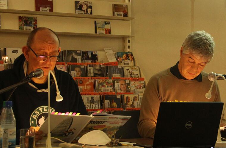 Zusammen mit der Volkshochschule (vhs) hatte das Team der Bücherei zwei Asterix-Übersetzer eingeladen. Die Würzburger Kai Fraass und Gunther Schunk aus Würzburg übersetzen aber nicht einfach die Comics, sondern erfinden eine ganz neue Geschichte mit den vorhandenen Bildern - und zwar im mainfränkischen Dialekt und angesiedelt im Gebiet um Würzburg. Obelix sieht darin aus wie ein Bocksbeutel und auch Kabarettist Urban Priol hat schon als Texter mitgewirkt.
