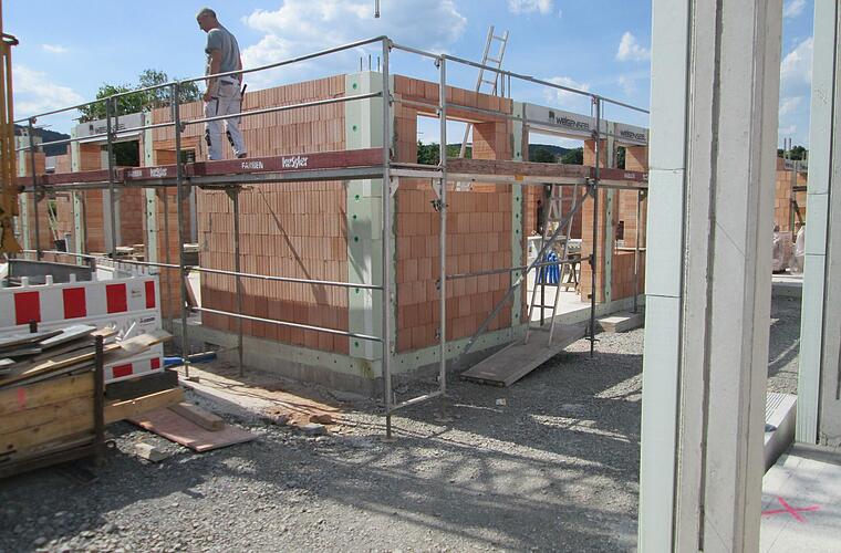An der Baustelle des neuen Feuerwehrgerätehauses im Baugebiet "Am Trimberger Weg" gibt es derzeit Bauzeitverzögerungen wegen Lieferschwierigkeiten des Stahlblechdachs. Die Bauarbeiten für den neuen Kindergarten gehen hingegen reibungslos voran. Mitte Juli, so schätzt Krumm, könne das Dach aufgesetzt werden.