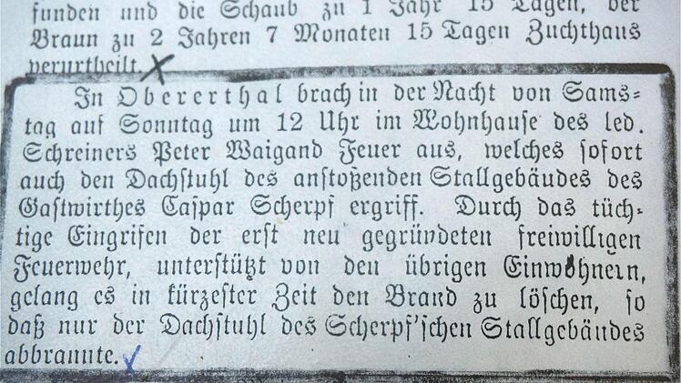 Wie es in der Anfangszeit bei der Obererthaler Feuerwehr zuging, lässt sich in der Chronik des Vereins nachlesen. Das Organ für amtliche Publikationen der königlichen Amtsgerichte Bischofsheim und Neustadt, "Rhön- & Saalpost", schrieb am 8. Mai 1890: "In Obererthal brach in der Nacht vom Samstag auf Sonntag um 12 Uhr im Wohnhause des led. Schreiners Peter Waigand Feuer aus, welches sofort auch den Dachstuhl des anstoßenden Stallgebäudes des Gastwirthes Caspar Scherpf ergriff.