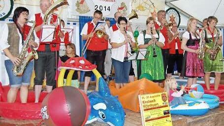Schnell war die Bühne zu einem Wasserspielplatz mit Planschbecken und kleinen Wasserbooten umgebaut. Das Wasser kam eiskalt vom Hydranten am Feuerwehrhaus. Schnell waren dafür auch die etwa 70 Meter Rohrleitungen aufgebaut. Die Musikerinnen und Musiker scheuten sich nicht mit ihren Trompeten, Klarinetten und Hörnern ins eiskalte Wasser zu steigen. Dazu waren sie sogar in ihre schicken Musikeruniformen geschlüpft. Denise Büchner als aktive Musikerin: "Es war zwar ungewöhnlich im kalten Wasser zu spielen, doch nach den ersten fünf Minuten hatte man sich an die kalten Temperaturen an den Füßen gewöhnt. Dann hat es auch richtig Spaß gemacht."