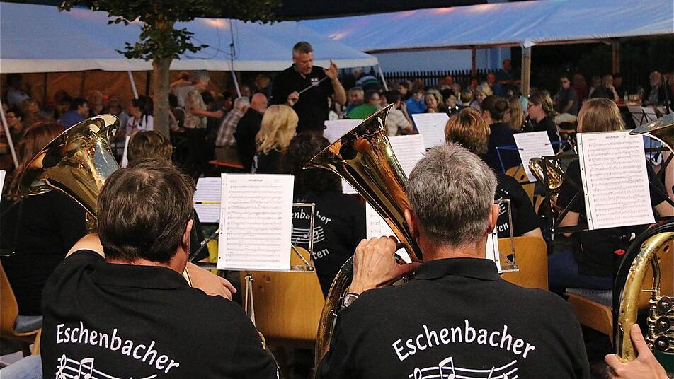 Die Instrumentalisten aus Ober- und Untereschenbach spielen unter abendlichem Himmel. Beim Fest vor der Eschenbachhalle hat nicht nur die Hauptkapelle ihren Auftritt.