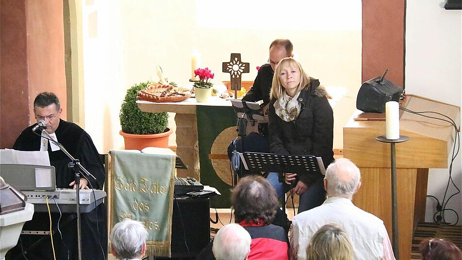 Dort waren am Sonntagvormittag sogar die Stehplätze eng geworden. Es war wieder ein Gottesdienst, den Linder am Keyboard zusammen mit Sängerin Sabine Schramm und Bassist Markus Weber gestaltete. "Wir zeigen Dankbarkeit für unser Leben, das seit vielen Jahrzehnten im Gegensatz zu vielen anderen Ländern hier gut und gesichert ist", lautete Linders Botschaft, die über den bloßen Erntedank hinaus ging.