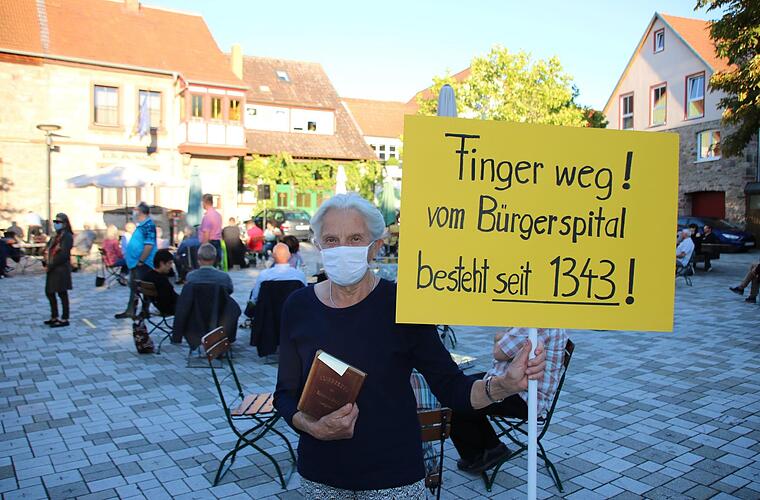 Sieglinde und Heribert Schilling haben es nachgeschlagen: In der ersten Stadt-Chronik von Notar Philipp Josef Doell ist die Gründung des Bürgerspitals auf das Jahr 1343 datiert. Deshalb steht auf dem Transparent, das die beiden 84-Jährigen mit zur Kundgebung auf den Viehmarkt gebracht haben: "Finger weg vom Bürgerspital, besteht seit 1343!" Heriberts Vater war viele Jahre als Stadtrat fürs Bürgerspital zuständig, für die Senioren ist das Pflegeheim aus der Stadt nicht wegzudenken. Und so geht es allen mehr als 100 Bürgern, die ebenfalls zu der von SPD und CBB organisierten Kundgebung auf den Viehmarkt kamen.