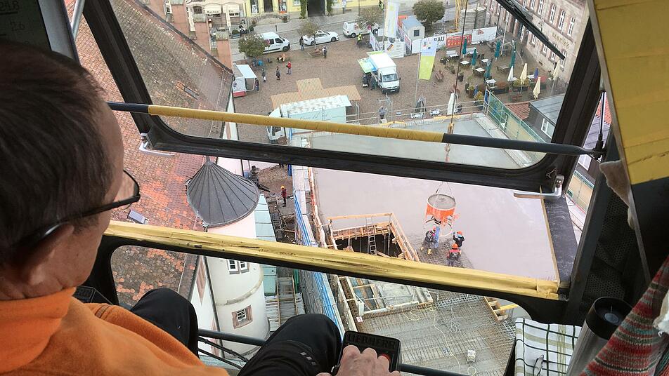 Das Bürgerhaus Hammelburg ist für den 62-Jährigen eine kleine Baustelle. Am Bau der Schleuse Rothensee zum Beispiel habe er drei Jahre lang mitgearbietet. Ähnlich lange verfolgte er einen Neubau des Klinikums Kassel von der Kabine des Krans aus mit. "Ohne Kran läuft heute nichts mehr auf dem Bau", sagt Hartmut Peter. Ob Schaltafeln, Metall-Bewehrung, Beton-Kübel oder fertige Betonteile: Für einen Rohbau müssen große Massen bewegt werden. Die schwersten Einzelteile beim Bürgerhaus waren die zehn Tonnen schweren Fertigdecken-Teile über dem Sitzungssaal. Die mussten auf den Buttenmarkt angeliefert werden, damit der Kran sie weit hinten heben kann. An der Spitze des 40 Meter langen Ausliegers kann der Kran noch rund dreieinhalb Tonnen anhängen. Durch eine schmale Gasse zwischen Gerüst und Rathaus kann Hartmut Peter deshalb den Beton-Kübel zum Betonlaster auf dem Marktplatz dirigieren. "Wenn er ganz voll ist, hat er rund drei Tonnen", sagt der Kranfahrer und zeigt auf die Anzeige, die das angehängte Gewicht dokumentiert.