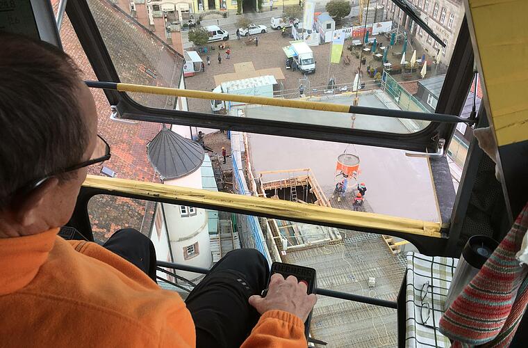 Die 30 Meter nach oben seien ja auch "keine Höhe". Der Kran sei gerade so doch, dass er ohne angehängte Lasten übers Rathaus schwenken kann. Deshalb mache er bei der Baustelle des Bürgerhauses auch mehrfach am Tag Pausen auf dem Boden. "Da ist man in fünf Minuten wieder oben", verweist er auch darauf, dass der Gang auf die Toilette jederzeit möglich sei. Das sei für einen Kranführer keineswegs selbstverständlich: "Bei einem richtig hohen Kran kommt es schon mal vor, dass man den ganzen Tag die Flasche nehmen muss."