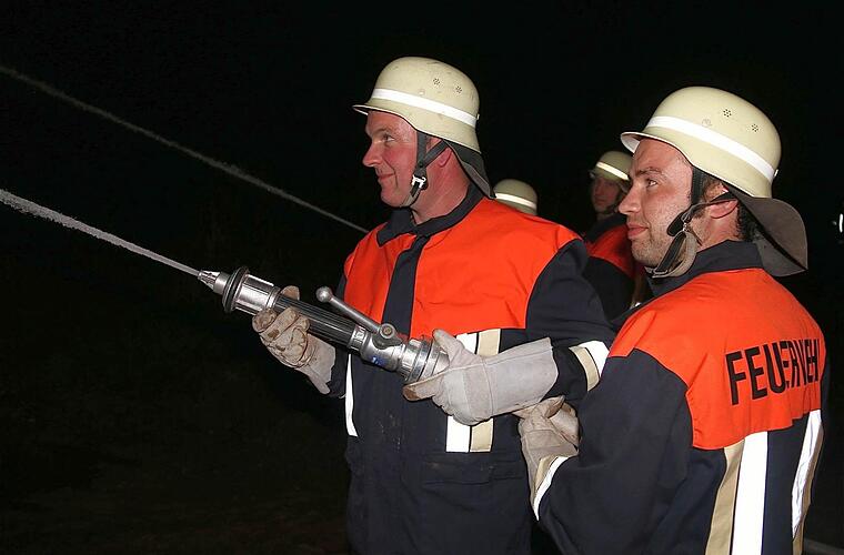 Pumpen sorgten für Druck Außerdem sorgten etliche Tragkraftpumpen für den nötigen Wasserdruck. Ganz vorn an der Schlauchstrecke warteten schon einige Floriansjünger an den Spritzen auf ihren Einsatz. Es klappte gut, bald stand genug Wasser zur Verfügung. Das landete dann aber nicht im Kuhstall, sondern auf dem benachbarten Acker. Thomas Eyrich zeigte sich zufrieden mit der Leistung.