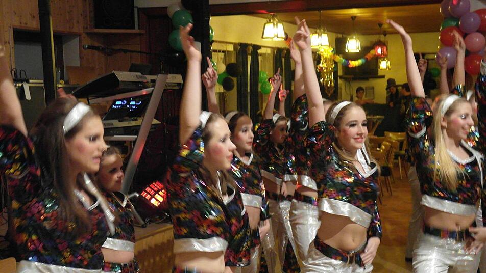Hits der 70er Jahre Die erste Attraktion des Abends war die Jugendgarde aus Fuchsstadt mit ihrer Vorstellung beim Machtilshausener Faschingsabend. Die jungen Damen und ein junger Mann überraschten die Zuschauer im Glitzerkostüm mit einer flotten Tanzdarbietung zu Hits der 70er Jahre. Einstudiert hat dies Karin Wiesler.