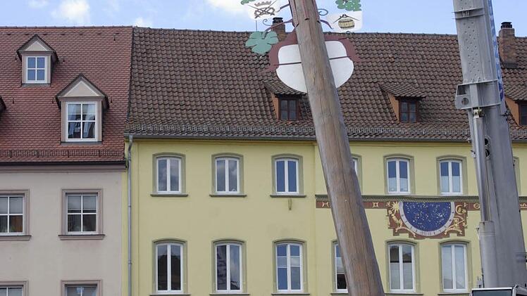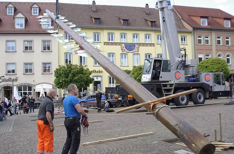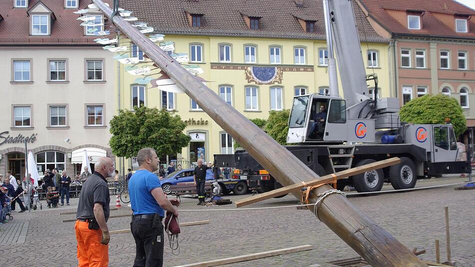 Mit vereinten Kräften und maschineller Hilfe wurde der 22 Meter hohe Zunftbaum auf dem Marktplatz aufgestellt. Zahlreiche Zuschauer ließen sich das traditionelle Spektakel nicht entgehen.