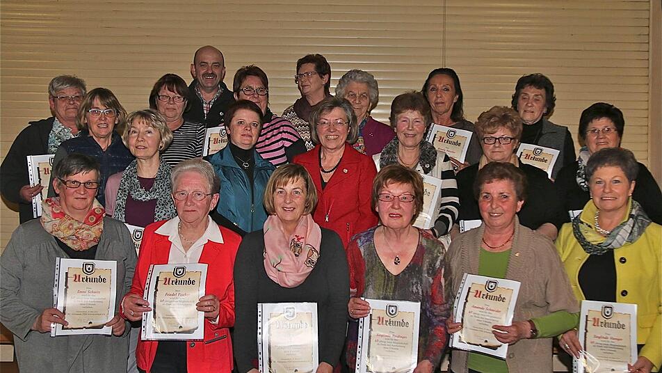 Die längste Ehrungsliste gab es für 40-jährige Mitgliedschaft: Gertrud Brustmann, Karin Eusemann, Friedel Fischer, Franziska Gerlach, Armin Hahn, Edeltrud Halemba, Ursula Häusler, Helga Heim, Doris Heim, Irmgard Heim, Monika Heim, Johanna Hepp, Sieglinde Hergenröder, Gerlinde Hoos, Martha