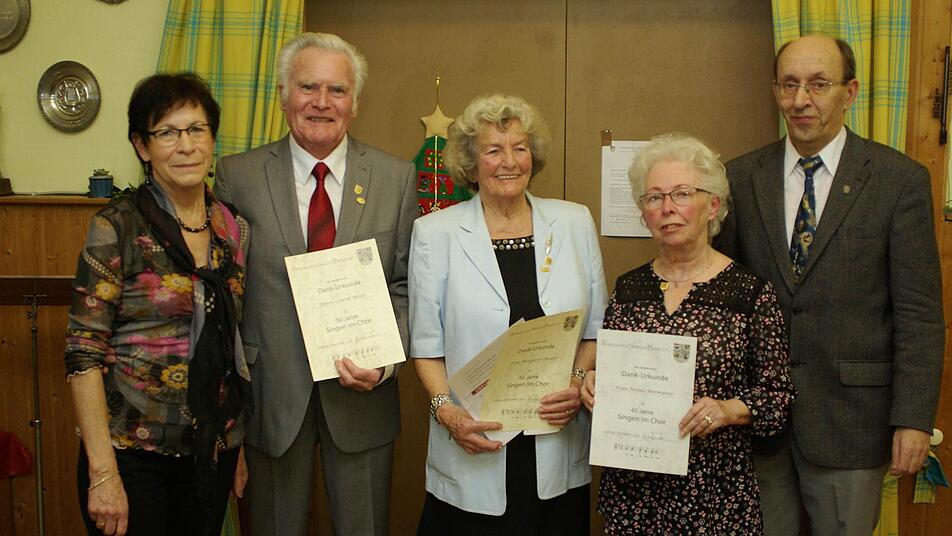 Im Anschluss ehrte er Margarete und Günter Bauer für 50 Jahre Chorsingen mit der goldenen Ehrennadel des Fränkischen Sänger-Bund (FSB) und des Deutschen Chor-Vereins (DCV), von dem das Ehepaar neben einer Urkunde auch den Ehrenausweis erhielt. Helma Herrmanns ist seit 40 Jahren aktive Sängerin und nahm ebenfalls die goldene FSB-Ehrennadel mit Urkunde entgegen. Gerhard Fella hält dem MGV seit zehn Jahren die Treue.