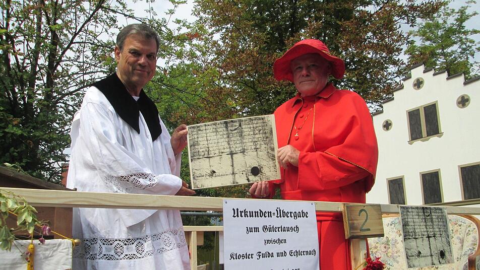 Der berittene Herold verlas am Zuganfang die Rahmenbedingung für ein sicheres Geleit in den beflaggten Straßen. Ihm folgte eine Kutsche, die den Gütertausch zwischen Fulda und Echternach thematisierte - die offizielle Gründung "Phusestats" im Jahre 907. Walter Hofmann und Horst Matzka beurkundeten als Repräsentanten den Landtausch.