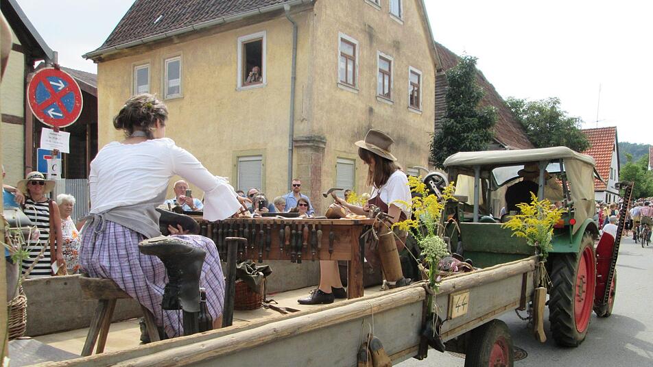 Großen Beifall fanden Motivwagen wie die Schuhmacherwerkstatt, Schmiede, Wagnerei sowie die Langholz-Transporteure. Die Motorräder des AMC sowie Traktoren aus alter Zeit schlossen den Festzug ab.