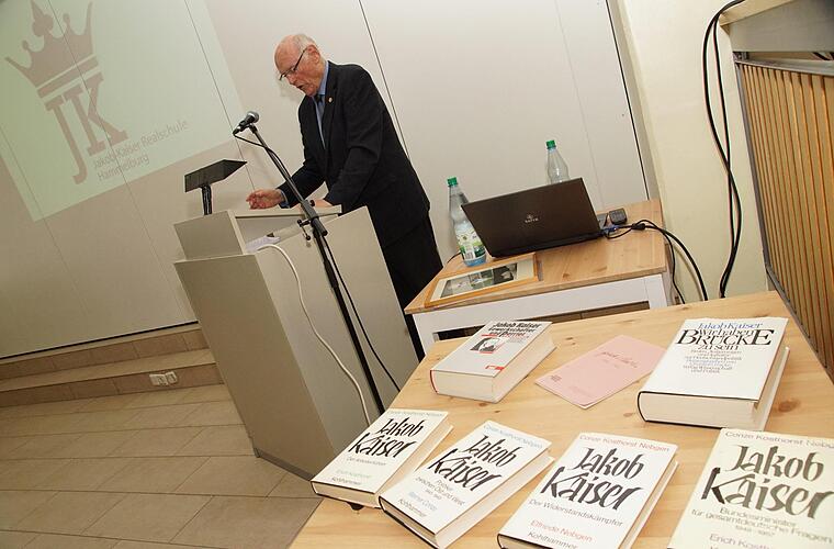 Winfried Benner, verheiratet mit einer Nichte von Jakob Kaiser, erzählte die frühe Familiengeschichte bis zum Zweiten Weltkrieg. Reinhard Schaupp referierte über die Zeit danach und Kaiser als Politiker. Neben den eigenen Neunt- und Zehntklässlern hatte die Realschule zu dem mehr als einstündigen Vortrag auch die Neuntklässler des Gymnasiums geladen.