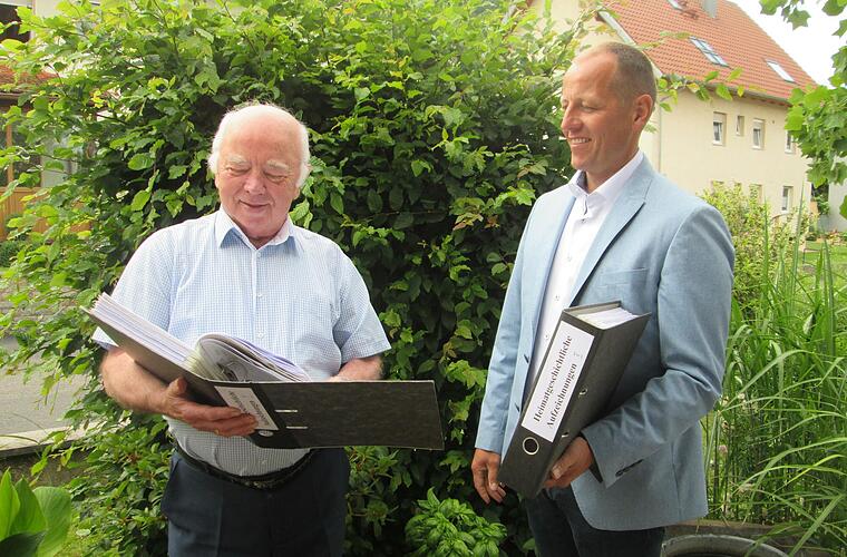 Der beeindruckte Johannes Krumm dankte dem Jubilar für die detailliert beschriebene und bebilderte Dorfchronik, die einen Ehrenplatz im Archiv des Marktes erhält.