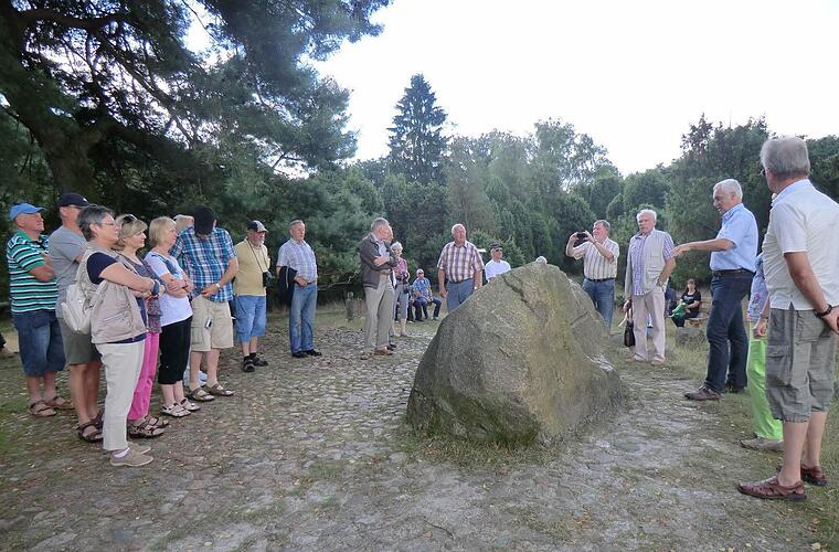 Unter einem Findlingsblock fand er seine letzte Ruhestätte. Den Nachmittag rundete eine Kutschfahrt zum Wilseder Berg ab. Auch durfte die Reisegruppe hautnah miterleben, wie etwa 700 Heidschnucken zu ihrem nächtlichen Quartier getrieben wurden.