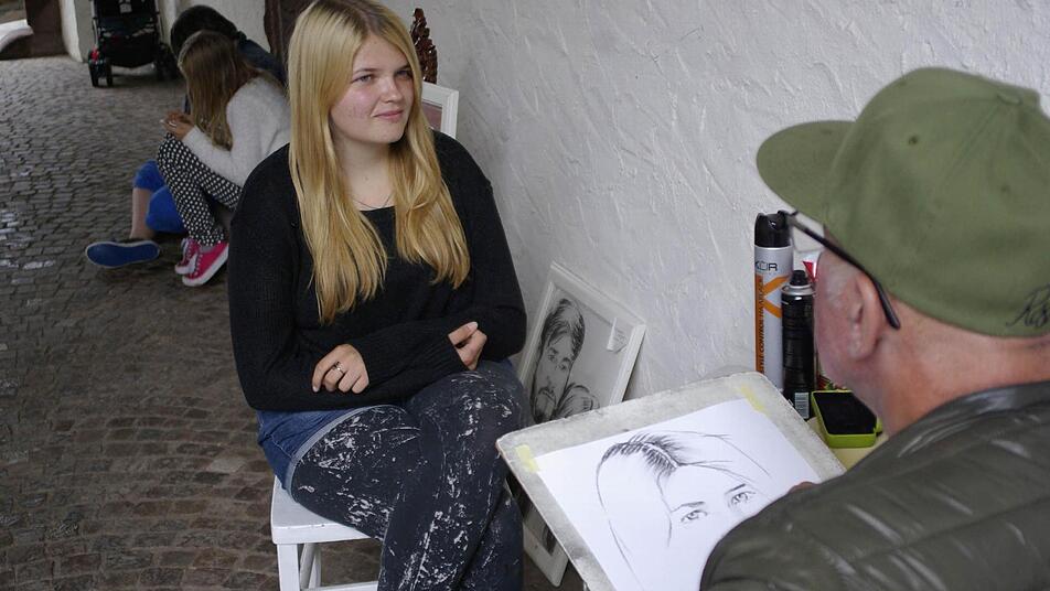 Mundartsänger Konrad Albrecht unterhielt die Gäste vor dem Erthal-Schloss und zeichnete nebenher noch Zehn-Minuten-Portraits, und das junge Duo "Drain-plug", die Obererthaler Dorfmusik, Urbi, die Eschenbacher Alphornbläser und Sebastian Voll hauchten dem Schlosshof tonales Leben ein. Nicht vergessen seien die "Glücks-DJs", die Samstagnacht für Stimmung sorgten, und Elke Drescher, die im Festzelt der Sportfischer unterhielt, die sich - wieder einmal - zahlreicher Gäste erfreuten. Im Hey-Hof präsentierte das junge Würzburger "Duo Arcoiris" seine Jonglage.