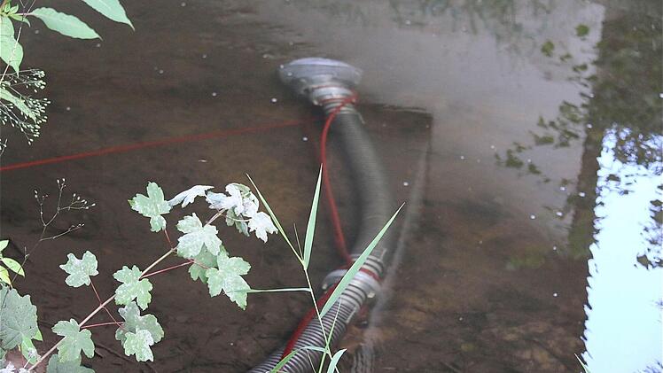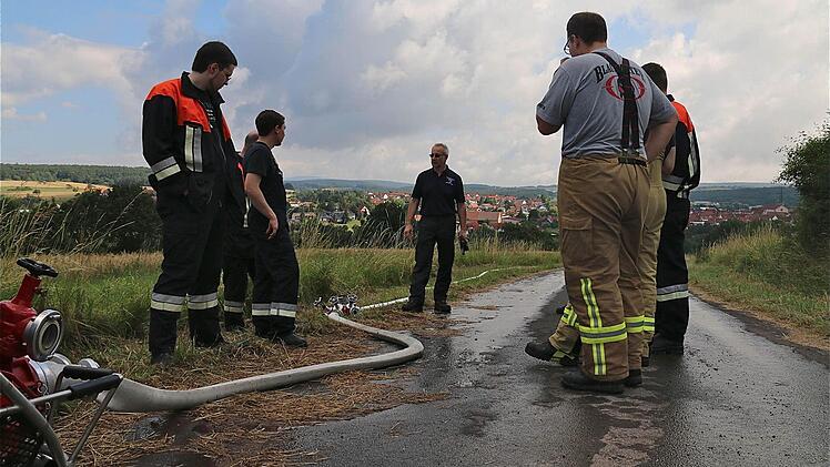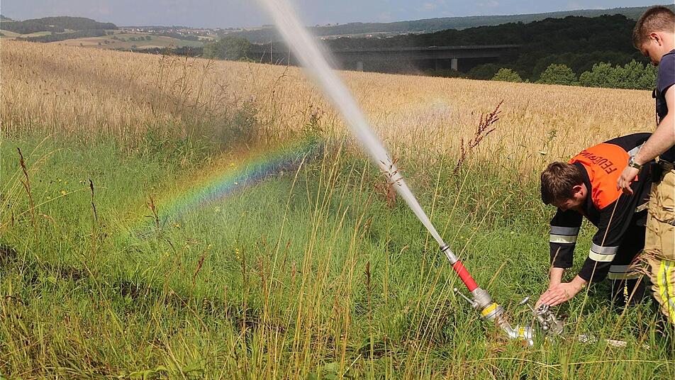 Die Grenzen der Physik Eine technische Herausforderung ist jene 660 Meter lange Schlauchstrecke (entspricht 33 Schläuchen), durch die das Wasser der Thulba den etwa 50 Meter hohen Berg hinauf gepumpt wird. Drei motorisierte Tragkraftpumpen sorgen für den nötigen Wasserdruck: eine bei der Wasserentnahme an der Thulba, eine weitere für die Fortleitung in der Streckenmitte und noch eine bei der Wasserabgabe ganz oben am Berg. Wenn die Pumpen zu weit auseinander stehen, kommt der benötigte Eingangsdruck des Löschwassers von mindestens 1,5 bar nicht mehr an der nächsten Pumpe an. Das Wasser verlässt die Pumpe mit einem Druck von rund acht bar, die sich über die lange Schlauchstrecke allmählich wieder abbauen.