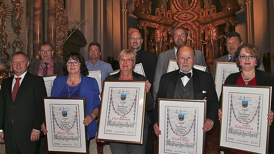 Landrat Thomas Bold verlieh Kulturehrenbriefe an neun verdiente Persönlichkeiten aus dem Landkreis. Das Spektrum ihres Engagements reicht von Mundart-Theater über Pflege von alten Bräuchen bis hin zur Leitung von Chören.