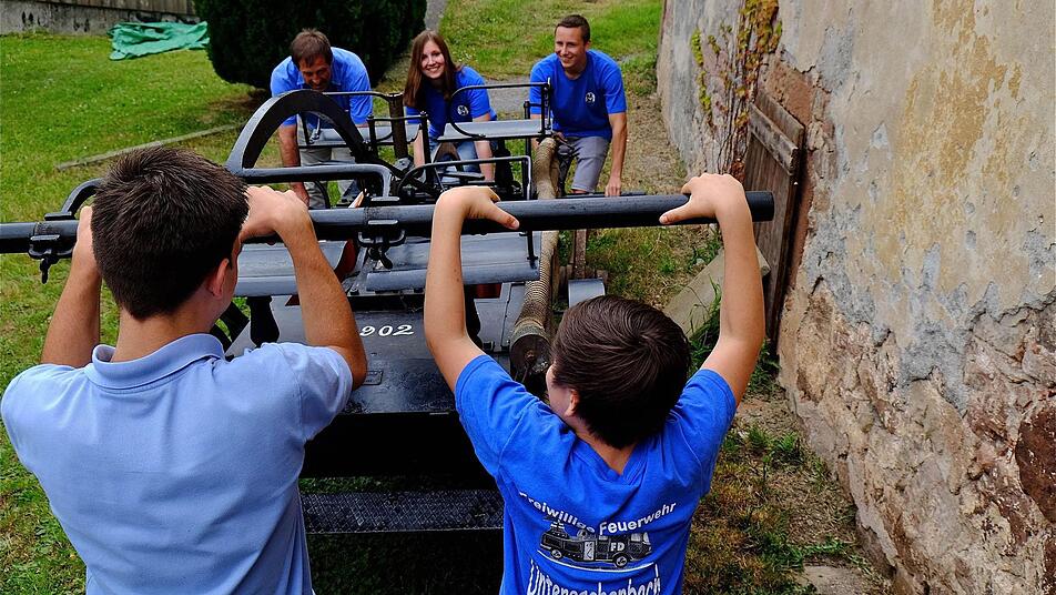 In einer Regenpause wurde die historische Saug- und Druckspritze von 1902 von der schützenden Plane befreit. Jugendliche machten sich an die Arbeit und betätigten die mächtigen Pumphebel für die Demonstration. Noch 1950 kam dieses Gerät bei einem Großbrand in Obereschenbach zum Einsatz. Pferde zogen damals den Pumpwagen zum Einsatzort.