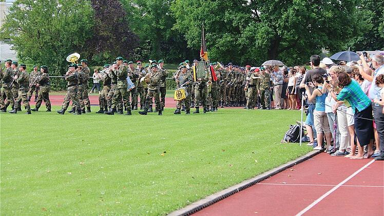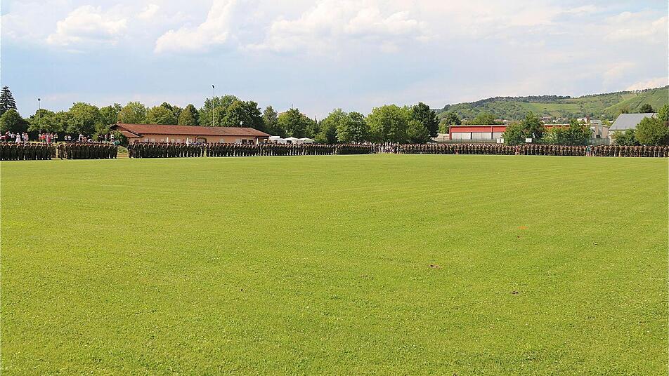 Der Hammelburger Marktplatz hätte nicht ausgereicht, um den nötigen Platz für die Vereidigung von 570 Offizieranwärtern zu bieten. So legten diese auf dem Sportgelände ihren feierlichen Treueeid ab.