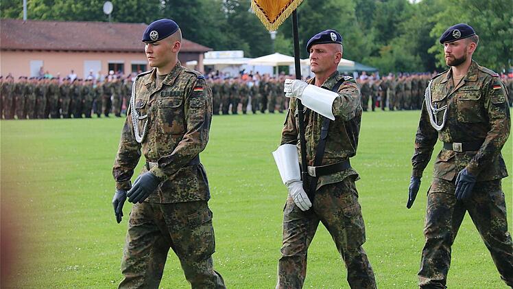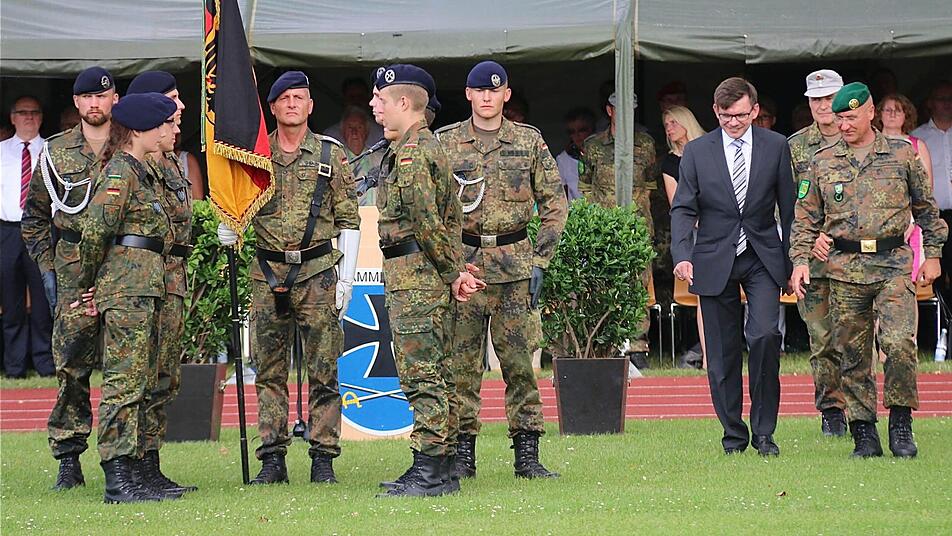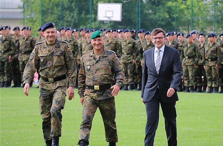 Entschuldigen ließ sich der Parlamentarische Staatssekretär Markus Grübel. So schritten der General der Infanterie, Brigadegeneral Gert-Johannes Hagemann, sowie der Kommandeur des Offizieranwärter-Bataillons 2, Oberstleutnant Manfred Scholl und Bürgermeister Armin Warmuth (CSU) die Ehrenfront ab. Höhepunkt war die Vereidigung, zu der sich die Fahne der Ehrenformation senkte.