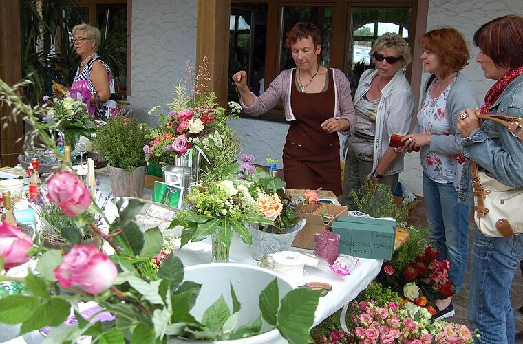 Poetische Töne Die Floristikmeisterin Ursula Spall aus Schondra schlug poetische Töne an: "Was brauchst du mehr zum glücklich sein? Die Rose öffnet unsere Herzen und lässt Liebe strömen." Spall zeigte den Interessierten, welch herrliche Gestecke mit den