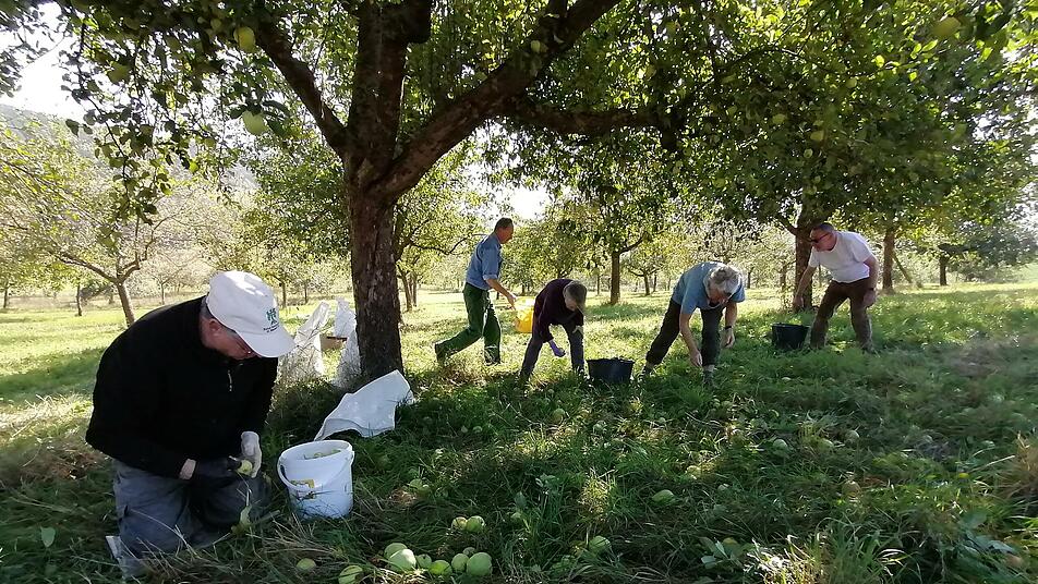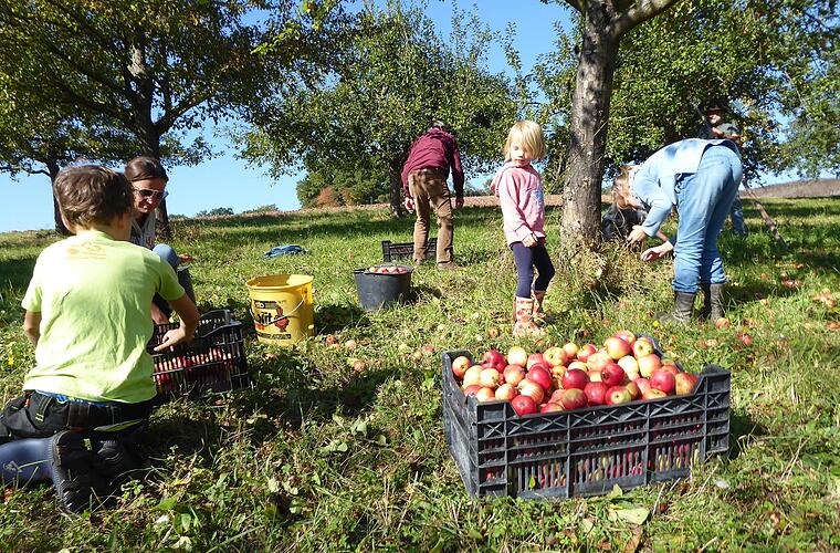 Passend zum sonnigen Herbstwetter hatten sich gut zwei Dutzend Helfer und Interessierte zum Apfelfest auf der Streuobstwiese des Bund Naturschutz in Untererthal eingefunden. Zuerst stand gemeinsames Ernten und Auflesen von unterschiedlichen Apfelsorten an. Dabei konnte Robert Hildmann Fragen zum Nutzen einer Streuobstwiese und zu den Apfelsorten beantworten.