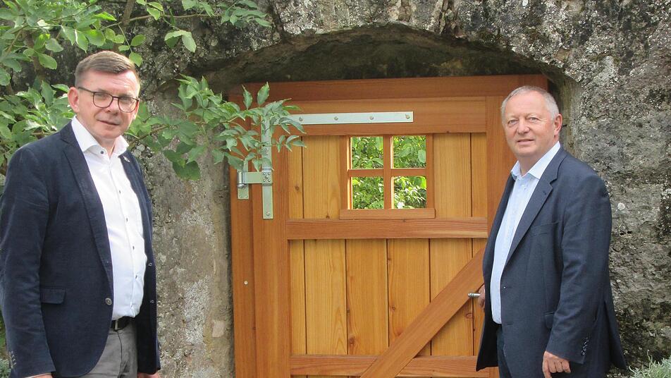 Das soll sich jetzt ändern. Es wäre auch zu schade, den früheren Klostergarten seinem Schicksal zu überlassen. Ein Anfang ist dank des Regionalbudgets der Allianz Fränkisches Saaletal bereits gemacht. So ersetzt eine neue Pforte mit Sprossenfenster aus Lärchenholz die alte Türe in der historischen Klostermauer. Des weiteren wurden drei Sitzbänke im unteren Gartenbereich aufgestellt. Zwei "Waldsofas" auf der Streuobstwiese und ein weiteres unter den Obstbäumen zieren inzwischen das Areal. Hinzu kommt eine Baumstamm-"Notenbank", die in ihrer Machart an Notenlinien erinnert.