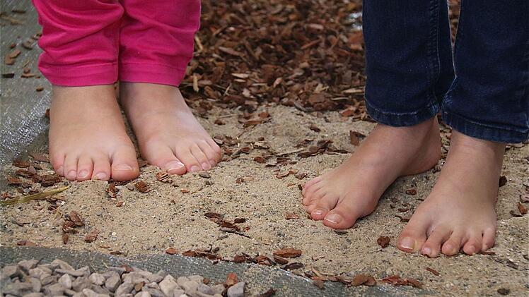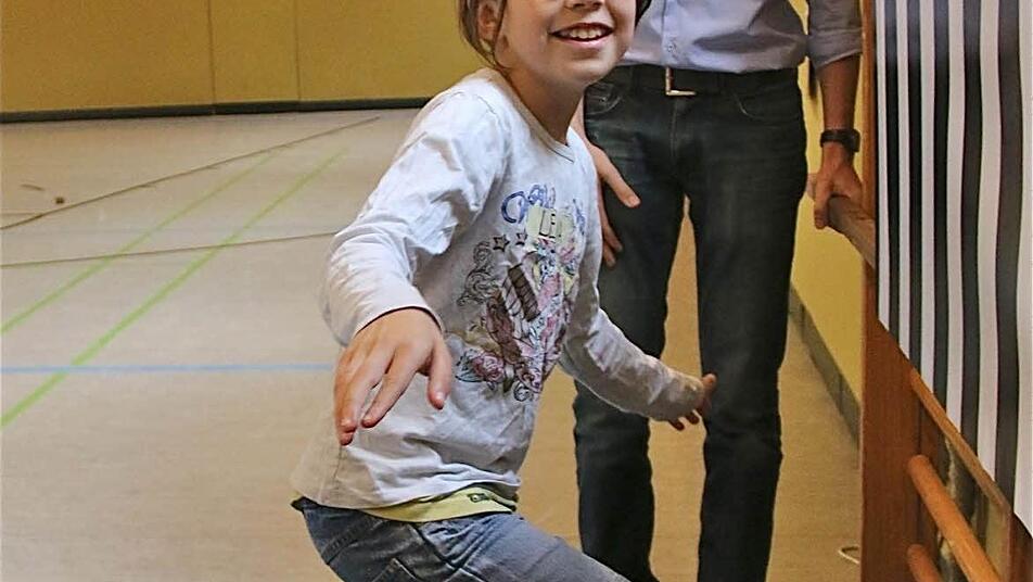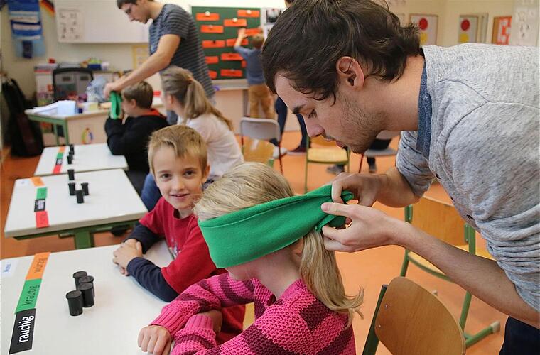 "Ich habe Vertrauen zu den Gymnasiasten", sagt Grundschülerin Selina, als ihr die Augen verbunden werden. Sorgsam wacht Sarah Rögner aus der Klasse 12Q darüber, dass Selina nicht umkippt, wenn diese blind und mit bloßen Füßen über den vorbereiteten Parcours "Fußfühlstraße" läuft. "Das ist Sand, das ist Mulch und das ist Kies", erkennt die Kandidatin. Auch mit den Händen werden Gegenstände in verschlossenen Boxen erfühlt.