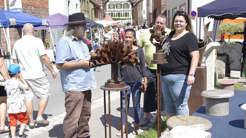 Unter den Ausstellern fand sich auch der heimische Bildhauer Peter Lorenz Emmert, der an einem Janus-Kopf mit zwei Gesichtern meißelte. Zahlreiche Stein- und Holzskulpturen schmückten seinen Stand vor dem Rathaus, wo er die Zeiger der Sonnenuhren gelegentlich einstellte. "Viele kommen und gucken, einige kaufen", lautete Emmerts Bilanz, die für viele Markthändler gelten darf.