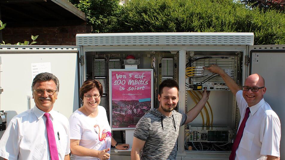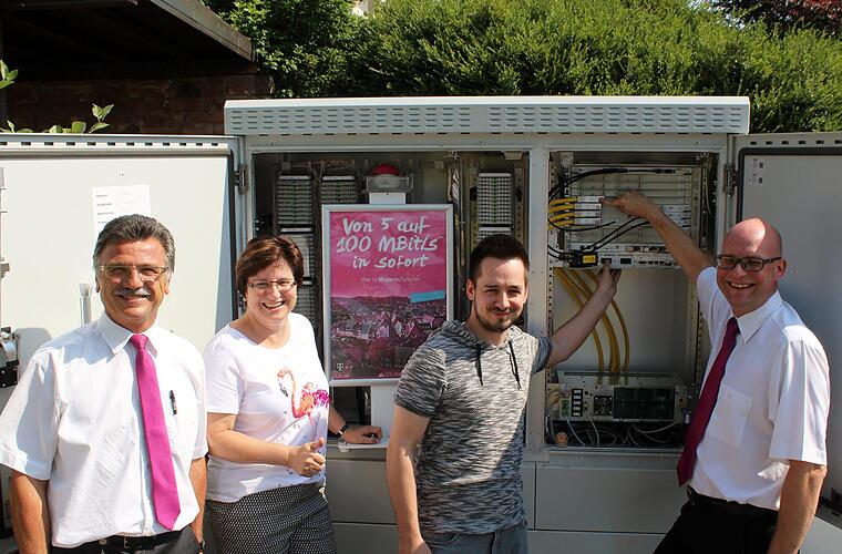 Euerdorf hat für den Fototermin mit dem symbolischen Knopfdruck, mit dem das schnelle Internet für die "Breet" im Schaltkasten gestartet wird, passend zu den Krawatten der Telekom Manager, extra ein T-Shirt mit Magenta Applikationen angezogen.