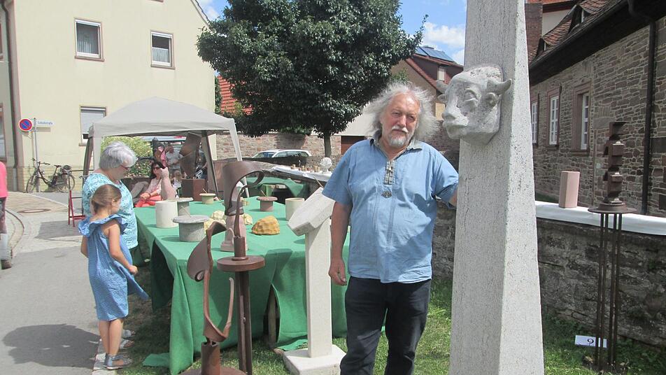 Bildhauer Peter Lorenz Emmert schmückte die Schlossmauer mit seinen Werken. Unter zahlreichen Unikaten aus Stein, Holz und Metall präsentierte er seine neueste Kreation, einen noch in der Fertigung stehenden "Maskenbaum". Das obeliskartige Gebilde erhält steinerne Naturmasken, von denen eine bereits die Säule ziert.