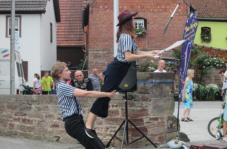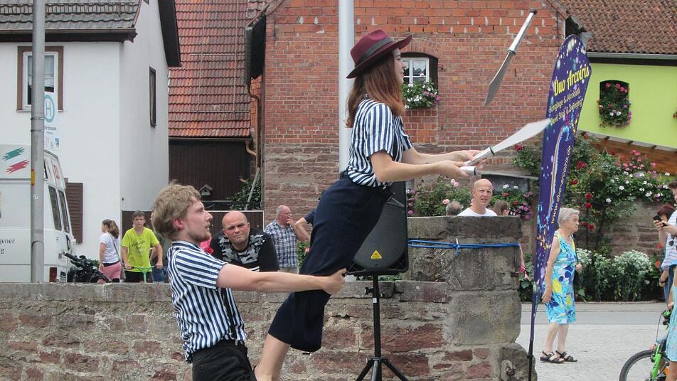 Stories und Geschichten stellte das Jonglage-Duo "arcoiri" auf dem Parkplatz neben dem Rathaus dar. Die beiden jungen Artisten Sonja Hohlfeld und Fabian Feitsch zeigten eine fantasievolle, selbst erstellte Show und verzauberten kleine und große Zuschauer mit erstaunlichen Jongleur-Kunststücken. Mit Bällen, Keulen, Ringen, dem so genannten "Devils-Stick" - und sogar mit echten Messern - begeisterten die Würzburger zu Swing-Melodien.