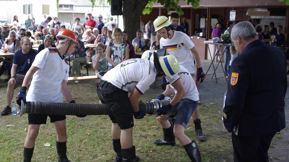 "Ihm ist es zu verdanken, dass sich eine Jugendfeuerwehr in Fuchsstadt gründet", unterstrich er. Burtchen, der 1967 in die Feuerwehr seines Heimatorts eintrat, war 33 Jahre Vorstandsmitglied in der Fuchsstädter Wehr, davon drei Jahrzehnte Schriftführer. Eine weitere Ehrung, nämlich die silberne Vereinsehrennadel, erhielt Kreisbrandinspektor (KBI) Peter Sell, für "die gute und unkomplizierte Zusammenarbeit", wie der örtliche Kreisbrandmeister (KBM) Oliver Lukaschewitsch lobte. Sell, zeichnete bis zum vorigen Jahr 13 Jahre lang als KBI verantwortlich. Neben Mittagessen, musikalischer Unterhaltung mit den "Fuschter Musikanten" und natürlich dem deutschen EM-Spiel boten die Floriansjünger einen spannenden Wettbewerb in Form des Saugschlauch-Kuppelns.