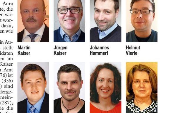Seit Jahrzehnten gibt es in Aura eine Einheitsliste. Das stellt sicher, dass die acht Kandidaten mit den meisten Stimmen im Gremium sitzen. Martin Kaiser (391 Stimmen) wurde im Amt bestätigt, Jürgen Kaiser (376) ist neu, Johannes Hammerl (336) und Hartmut Vierle (299) sind die weiteren beiden wiedergewählten Räte. Neu im Gemeinderat sind Manuel Kolb (287), Carsten Hack (286) sowie die beiden Frauen Silvia Dörfler (235) und Jutta Hofmann (230). Knapp nicht gereicht hat es für Daniel Kaiser (224). Insgesamt 30 Bürger wurden je einmal benannt. Ein Fehler hat sich gestern beim Bürgermeister-Ergebnis eingeschlichen: Thomas Hack hatte tatsächlich 93,65 Prozent der gültigen Stimmen.