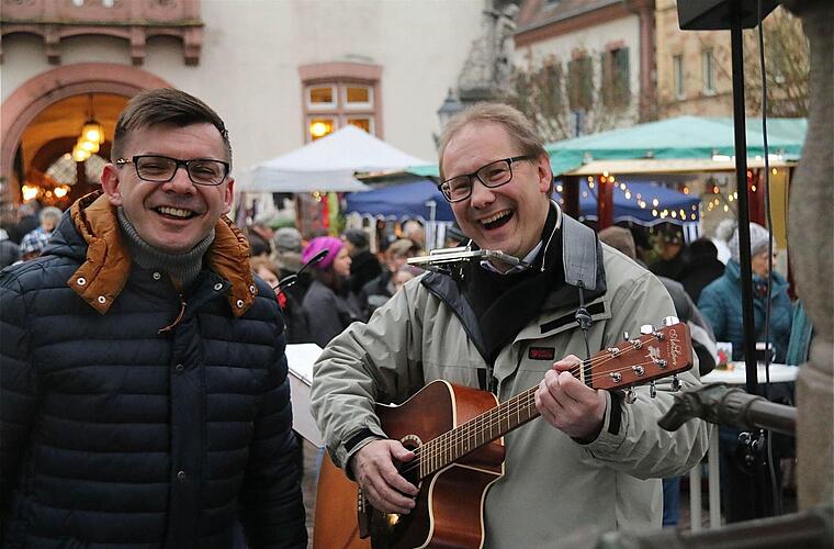 Moderne Weihnachtslieder lagen auf den Notenpulten. Drei Proben waren dem Gesangsauftritt von Warmuth und Eschenbacher vorangegangen. "Und wenn er wirklich wiederkäm´" lautet das Lieblingslied des Bürgermeisters.