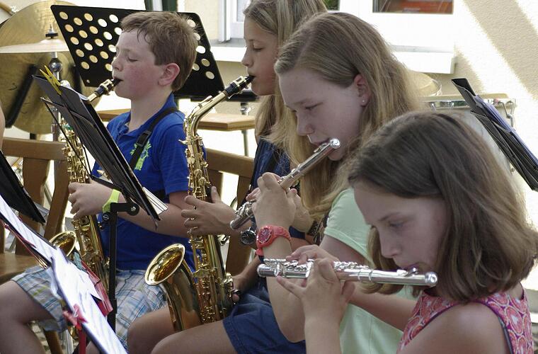 Jürgen Kunkel, die Kinder der musikalischen Früherziehung, unter Leitung von Birgit Kessler, die Erwachsenenbläserklasse "Luftikus", die Jugendkapelle aus Oberleichtersbach, Leitung Christoph Emmerth sowie die gemeinsame Jugendblaskapelle aus Unter-, und Obererthal und Diebach, die Helmut Schäfer führte. Ihnen oblag es, den Sonntag bei schwülen 35 Grad musikalisch zu gestalten. Die jüngsten Besucher bevorzugten zu dieser Tageszeit das "Fischfangbecken", ein Wasserbassin im Schatten, in dem sie toben und "angeln" konnten.