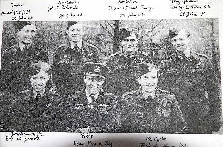 Alle sieben Soldaten kamen ums Leben: Pilot Henri Mari de Bij (32), Flugingenieur Sergeant Sidney William Ede (28), Navigator Frederick (32), Bombenschütze Sergeant Bob Longworth (Alter unbekannt), Funker Sergeant Bernard Withfield (20), Maschinengewehr-Vorderschütze Sergeant Thomas Edward Teanby (23) und Maschinengewehr-Heckschütze Sergeant John Reuben Ridsdale (20). Sie wurden zunächst im Schwärzelbacher Friedhof begraben. Nach Kriegsende wurden sie exhumiert und fanden ihre letzte Ruhe im Soldatenfriedhof Dürnbach (Oberbayern).