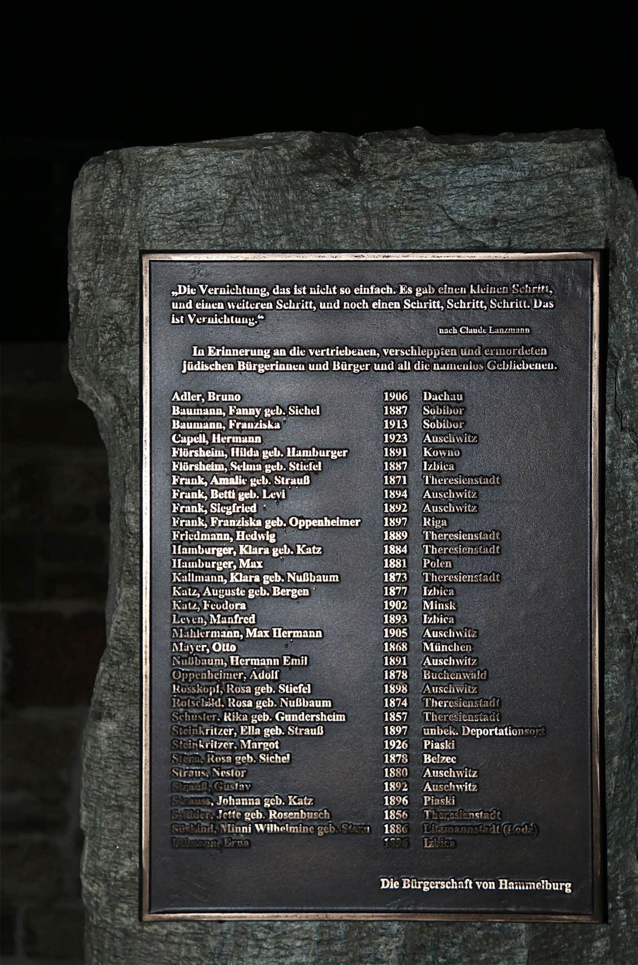Mit ihr erinnern Stadt und Bürgerschaft an die "vertriebenen, verschleppten und ermordeten jüdischen Bürgerinnen und Bürger und all die namenlos Gebliebenen". Die 33 Namen auf der Tafel bezeugen ergreifende Schicksale: All diese Menschen starben in den Konzentrationslagern von Dachau, Theresienstadt, Auschwitz, Sobibor, Buchenwald und weiteren Orten.