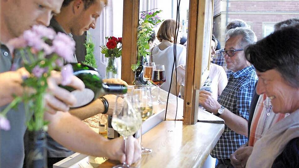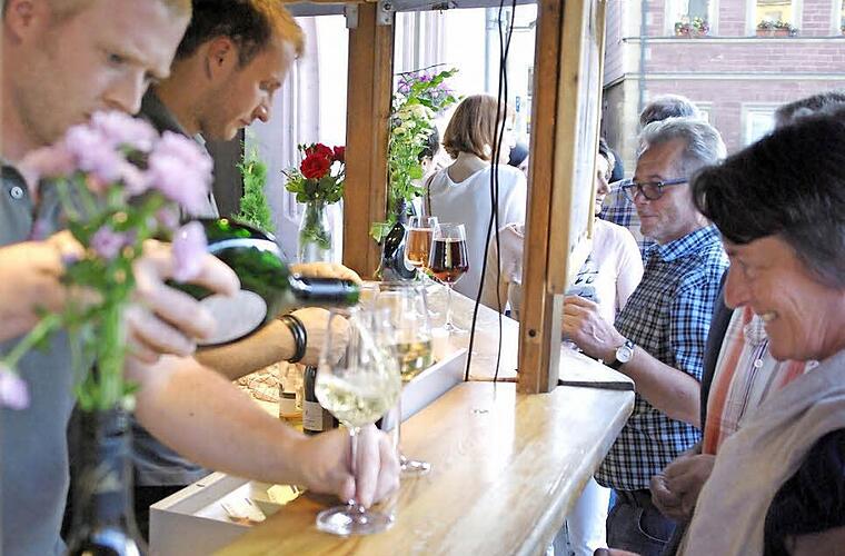 Schlange stehen nehmen die Besucher für einen edlen Tropen in Kauf. Für die "feste Nahrung" sorgt diesmal die Familie Speil - Gastronomen aus Schweinfurt - und die Bäckerei Walter Emmert mit Spezialitäten aus der Region.