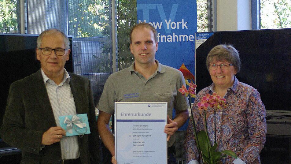 Das Lob galt Thorsten Bayer, der seit 25 Jahren in der Firma tätig ist und hier auch seine Ausbildung als Radio- und TV-Techniker erhielt. Bayer, der die Kunden im Unterhaltungs-, Elektro- und Elektronikbereich betreut, legte 1995 seine Gesellenprüfung ab und arbeitete seither ununterbrochen im Fuchsstädter Unternehmen.