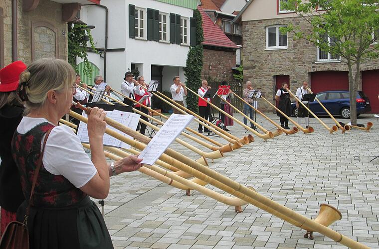 Die Alphornbläser des Fortgeschrittenen-Kurses an der Musikakademie präsentierten zum Abschluss mit ihren Dozenten ein abwechslungsreiches Konzert. Ein Stück war der "Amalberga" gewidmet.