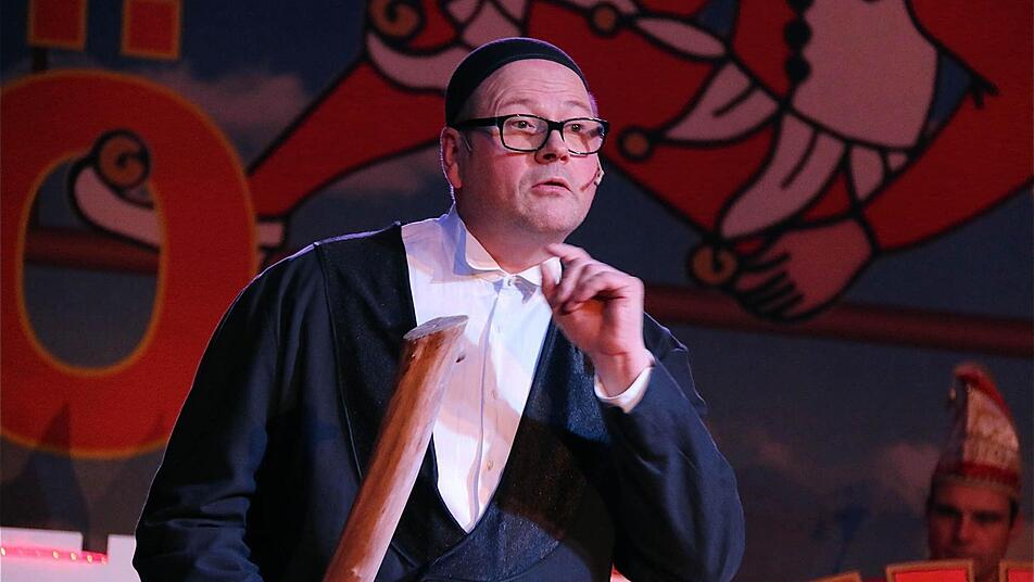 In seinen Bann hatte auch heuer wieder Michael von Prümmer als wachsamer Lehrer Lämpel in der Bütt sein Publikum gezogen. Den üblichen Pädagogenstock tauschte er jetzt mit einem langen Knochen: "Ich grüße aus dem Neandertal". Doch weilte Lehrer Lämpel nicht lange in extrem alten Zeiten sondern schaffte den geschichtlichen Bogen über mittelalterliche Kreuzzüge bis hin zur Neuzeit mit aktuellen Themen wie "Stromtrasse im Thulbatal" oder Moralisten und Salafisten. "Religion dient nur der Zierde", zog Lämpel sein Fazit über aktuelle Attentate und über das Geschäft mit der Angsterzeugung.
