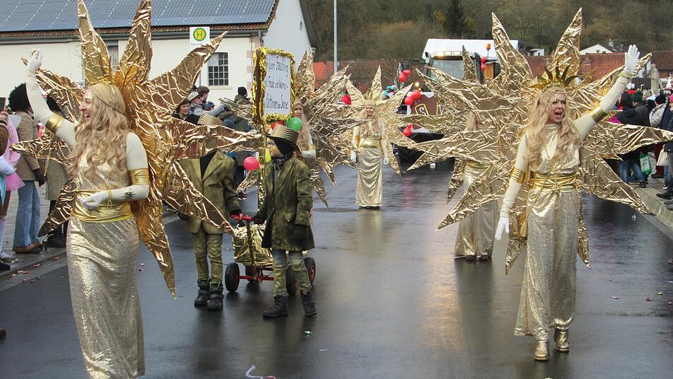 Das Prinzenpaar, Natascha und Manuel, schaukelte eine Gondel über die Saalebrücke, begleitet von der Showtanzgruppe "Wilde 14", die den Fasching aus aller Welt nach Aura holten. Die erfolgreiche Jugendarbeit der Faschingsfreunde spiegelte das Kinderprinzenpaar Leni und Max in einem sich drehenden Muffin-Wagen wider. Aus einer bezaubernden Unterwasserwelt grüßten die Kindergartenkinder, und der Jugend-Elferrat brachte die Besucher mit Reggae-Melodien zum träumen.