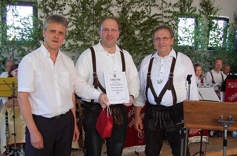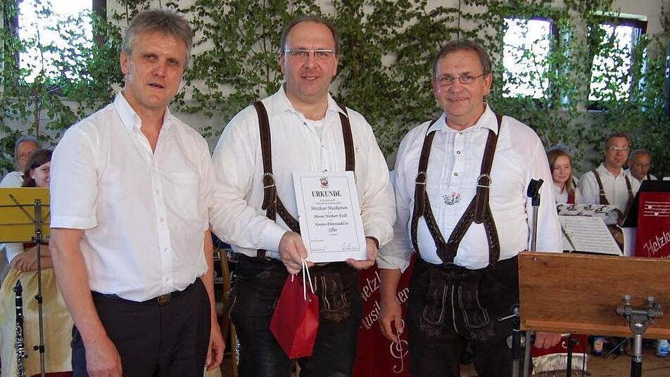 Eine Überraschung gab es für Norbert Kolb. Bei den Hetzlosern spielt er seine Tuba seit 25 Jahren. Dafür wurde er vom Dirigenten Robert Knüttel ausgezeichnet. "Ich habe beim Jugendmusikkorps Bad Kissingen gelernt und als ich dort ausscheiden musste, bin ich gerne nach Hetzlos gekommen. Mir macht Musik viel Spaß und hat mir schon über manches Unangenehme im Leben hinweggeholfen", meinte Kolb.